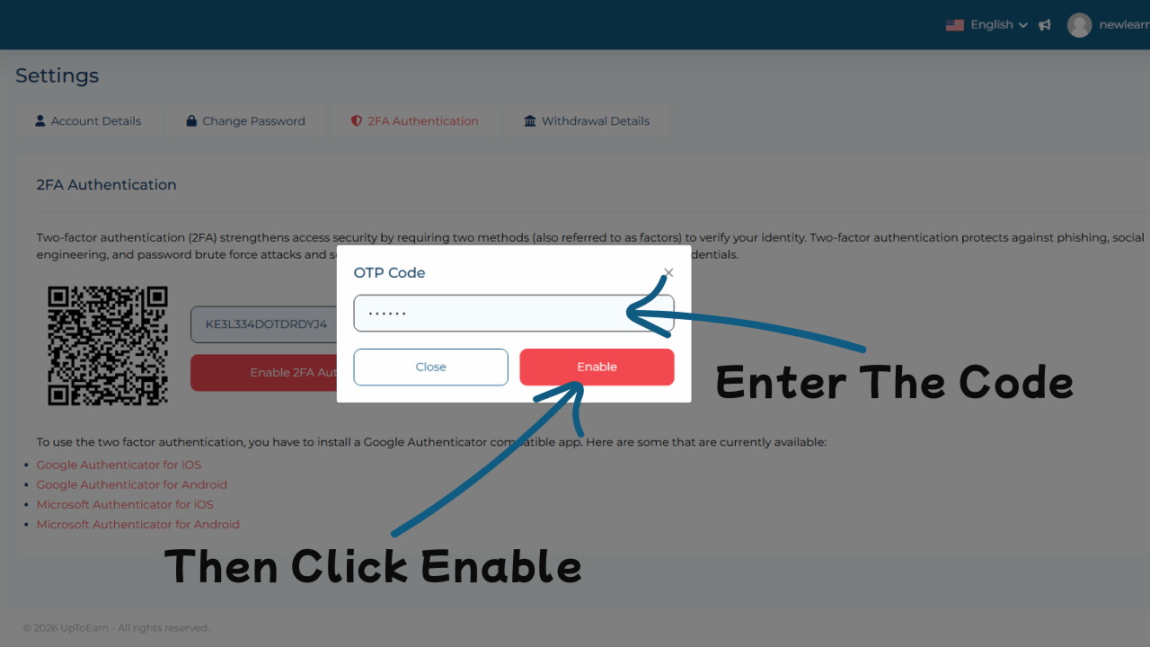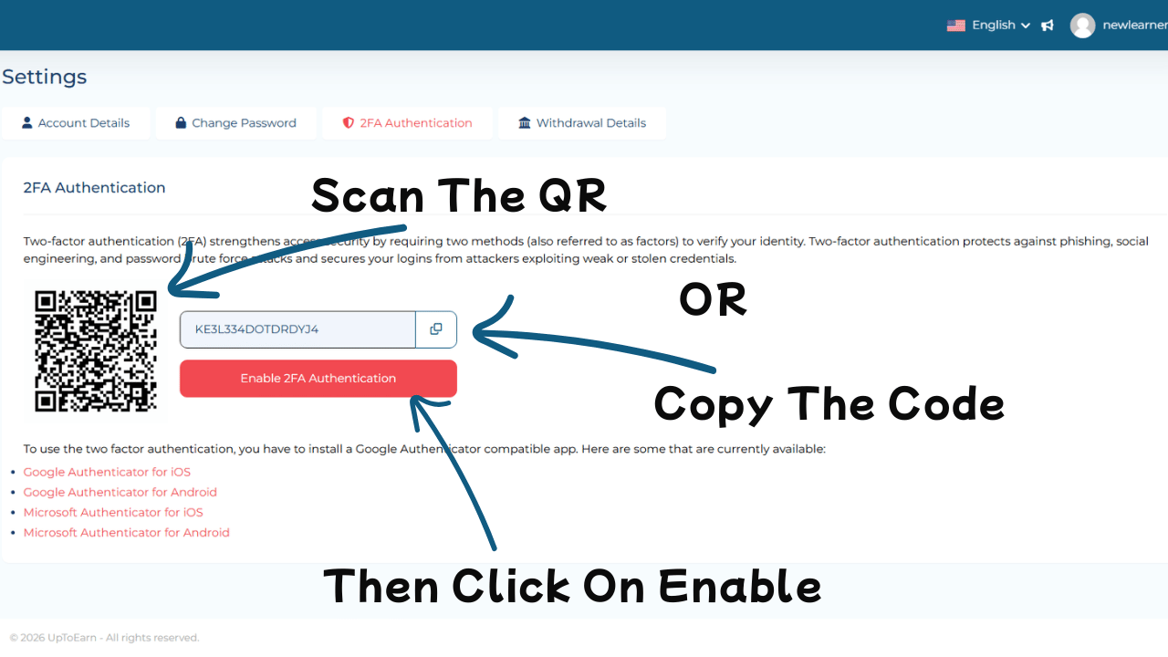 Step-by-Step Guide to Enable 2FA on UptoEarn.org